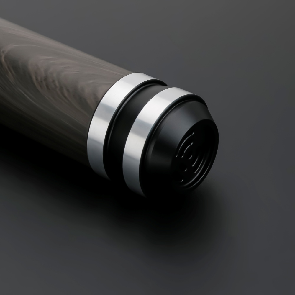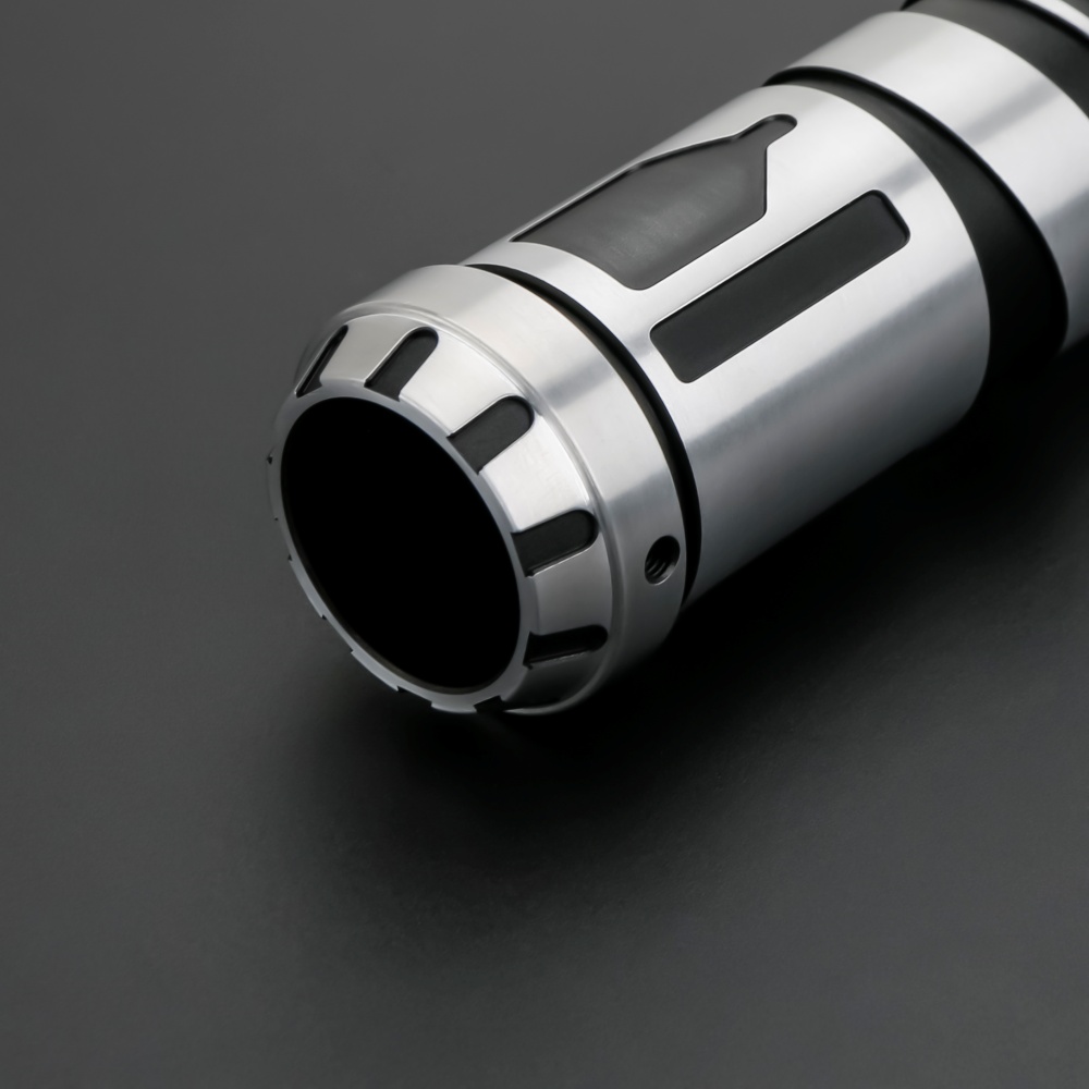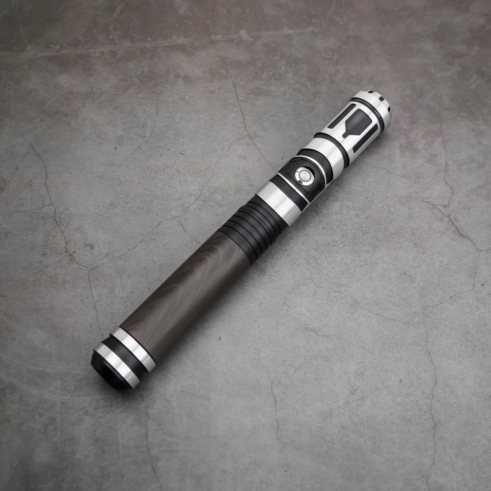 A blend of ‘edgy’ metallic design and nature inspired grain. Available in either an RGB baselit or a SN-Pixel install option. This is an exquisite design. A milled emitted coupled with a wood-look grip makes this a very unique model dueling model. The saber is installed with an internal recharge port so as not to impact the svelt lines. Switch LED colours may vary.