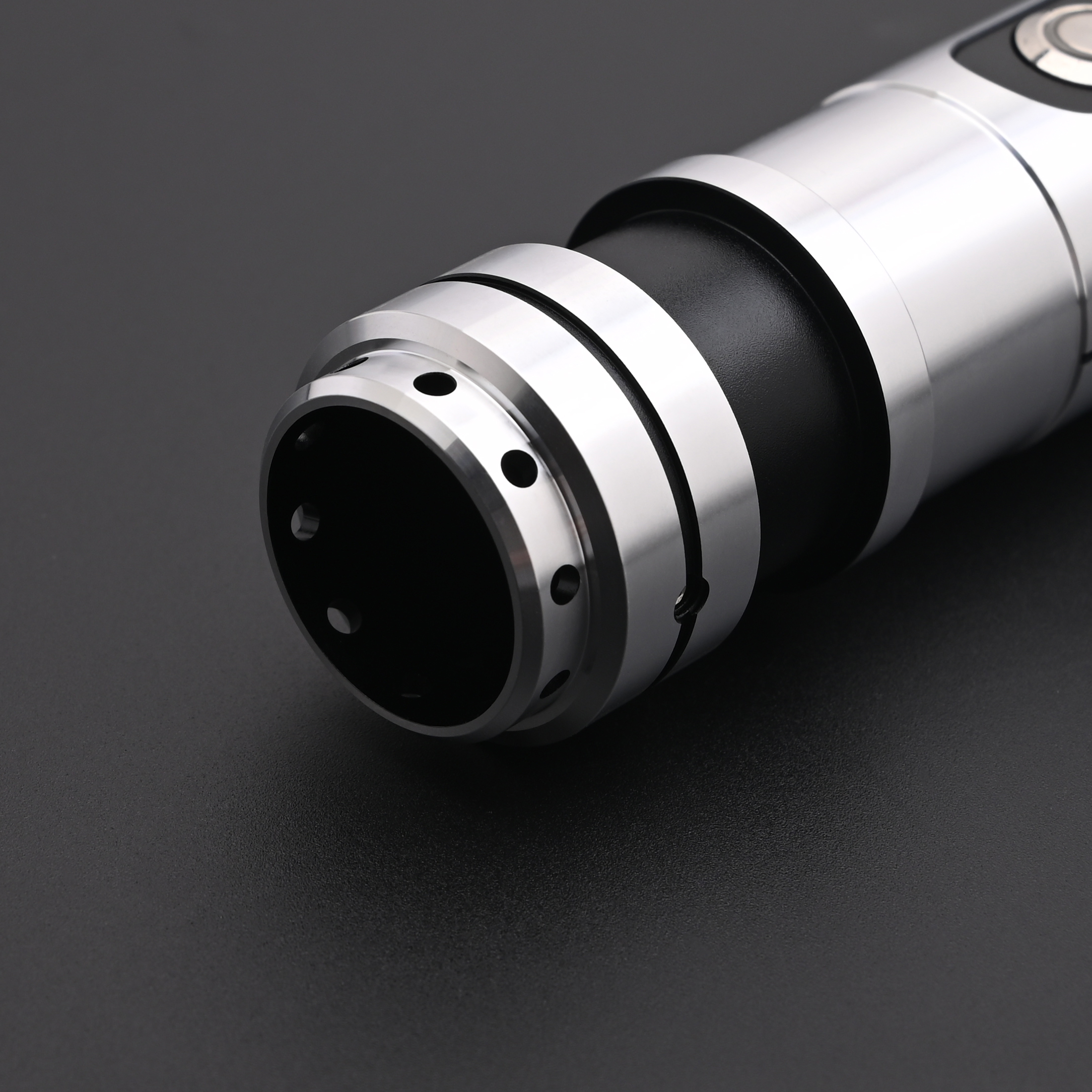 A gorgeous svelte design available in either an RGB baselit or a SN-Pixel install option. A mix of sleek, uncomplicated lines and a textured grip make this a great choice for an RGB baselit dueling model. The saber is installed with the newer model chassis with an internal recharge port so as not to impact the functional tone. Switch LED colours may vary.